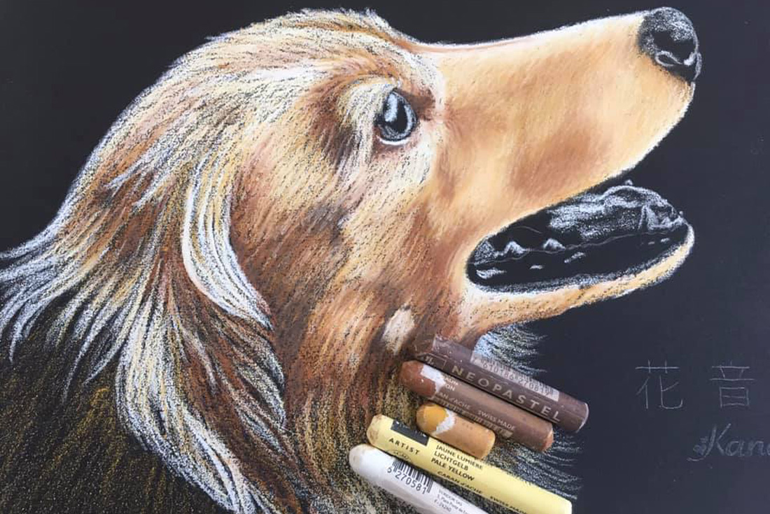 チョークアートに使う#オイルパステル は、とても柔らかくて太いです。三文判くらい。筆圧や角度を調整しながら毛並みを描いています。